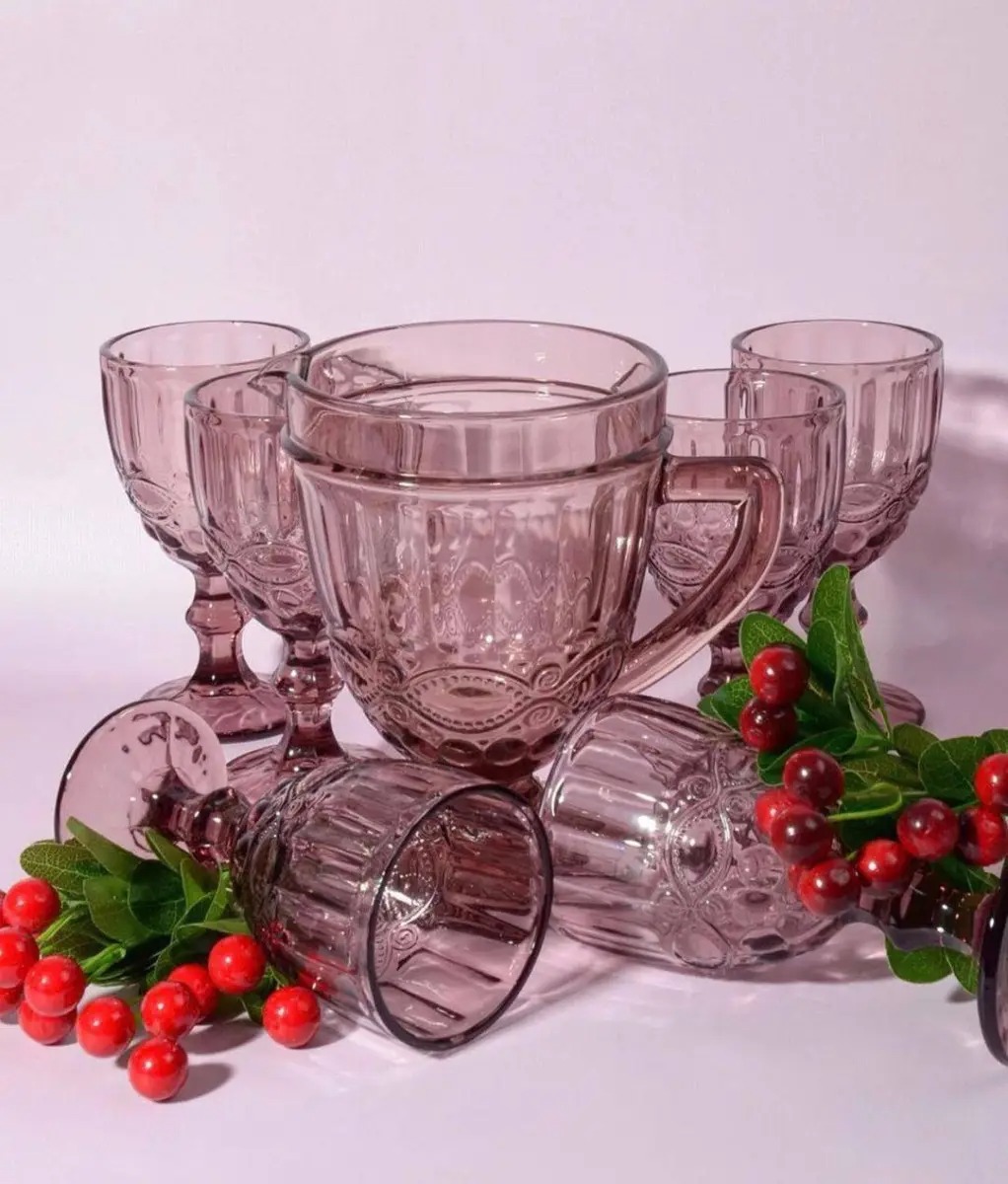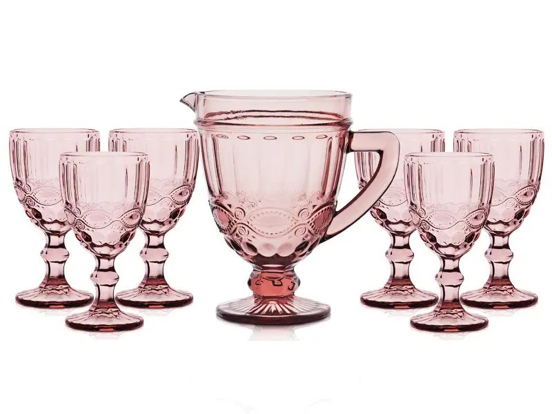 Набір посуду для напоїв Вінтаж рожевого кольору 7 предметів неодмінно стане прикрасою вашого святкового столу. Набір складається з глечика об’ємом 1 л та 6 келихів кожен об’ємом 300 мл (корисний об’єм келиха трохи менший). Виготовлений набір із якісного товстого кольорового скла, яке не втрачає свій вигляд при щоденному застосуванні. Келихи мають ефектну форма кубка та широку ніжку, яку дуже зручно тримати у руці.